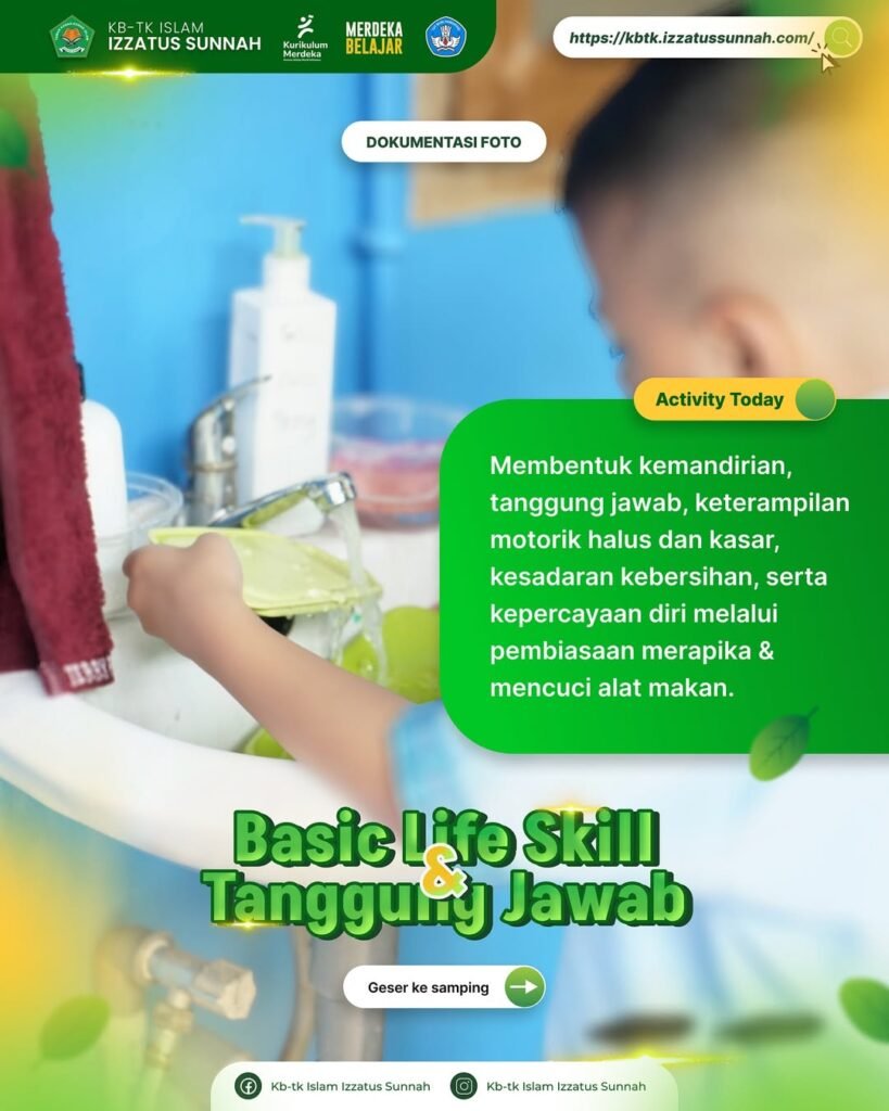 - Basic life skill & Tanggung Jawab anak, Membentuk kemandirian, tanggung jawab, keterampilan motorik halus dan kasar, kesadaran kebersihan, serta kepercayaan diri melalui pembiasaan merapika & mencuci alat makan.