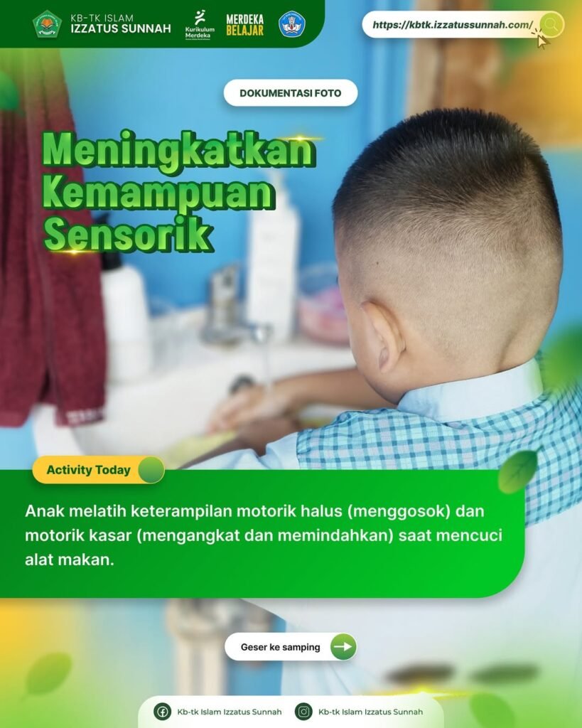 - Meningkatkan kemampuan sensorik, Anak melatih keterampilan motorik halus (menggosok) dan motorik kasar (mengangkat dan memindahkan) saat mencuci alat makan.